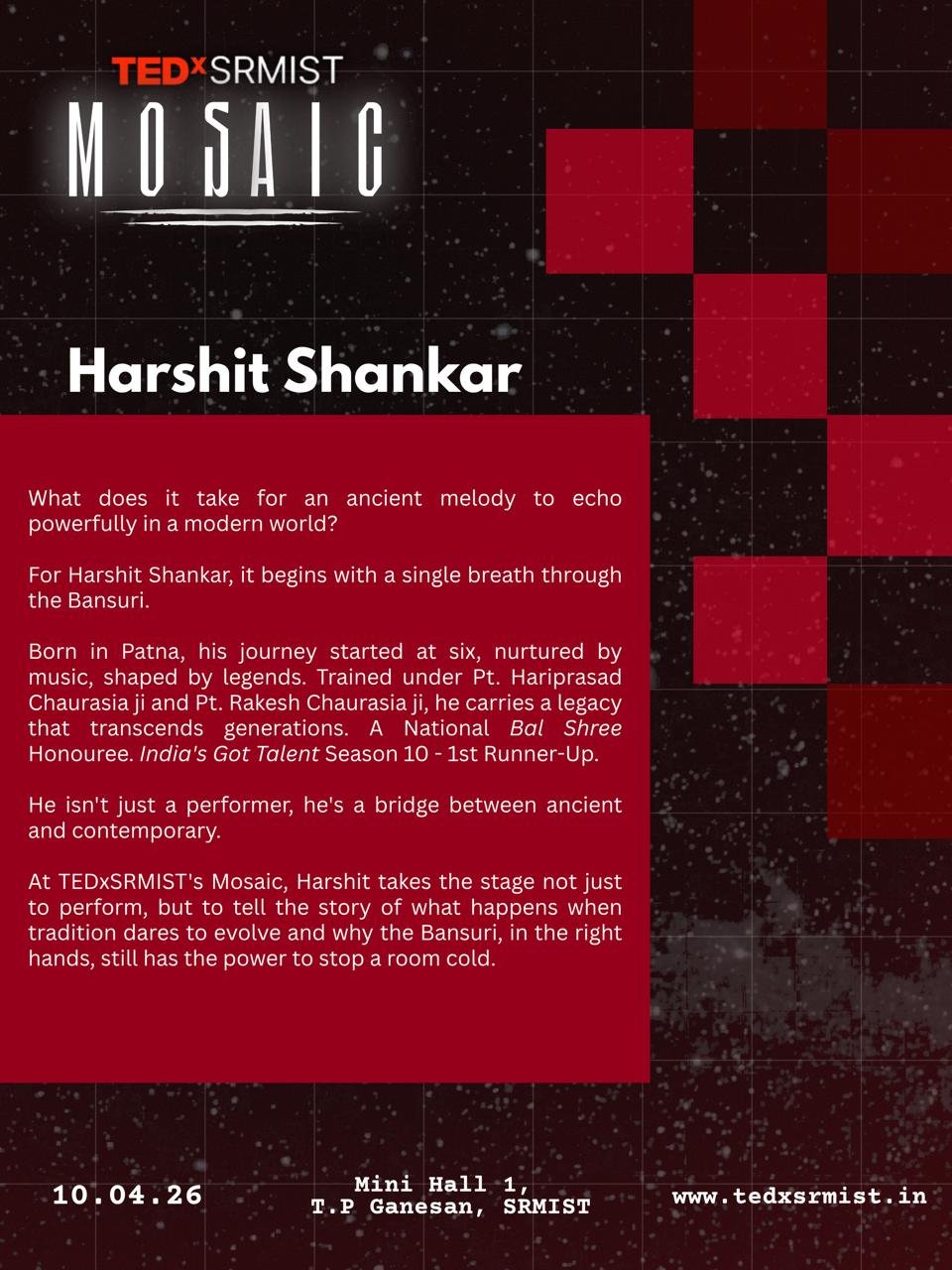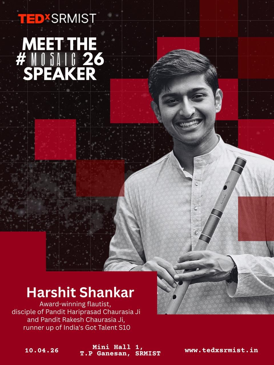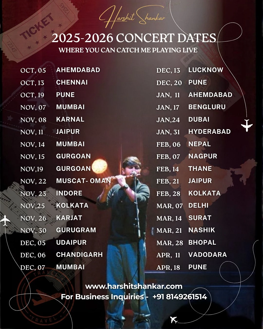 Harshit Shankar, a talented flautist from Mumbai, has been captivating audiences with his soulful performances since the age of six. Trained by esteemed maestros like Pt. Hariprasad Chaurasia Ji, Pt. Rakesh Chaurasia Ji and Pt. Rajendra Prasanna Ji, Harshit blends classical and contemporary styles, earning recognition in both traditional music circles and modern platforms like Bollywood and India’s Got Talent.